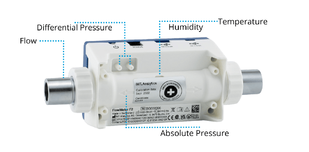 El FlowMeter F2 mide el caudal de gas, el volumen, la presión absoluta, la presión diferencial, la temperatura y la humedad, además puede conectarse mediante bluetooth a dispositivos inteligentes como tablets o smartphones en tiempo real.