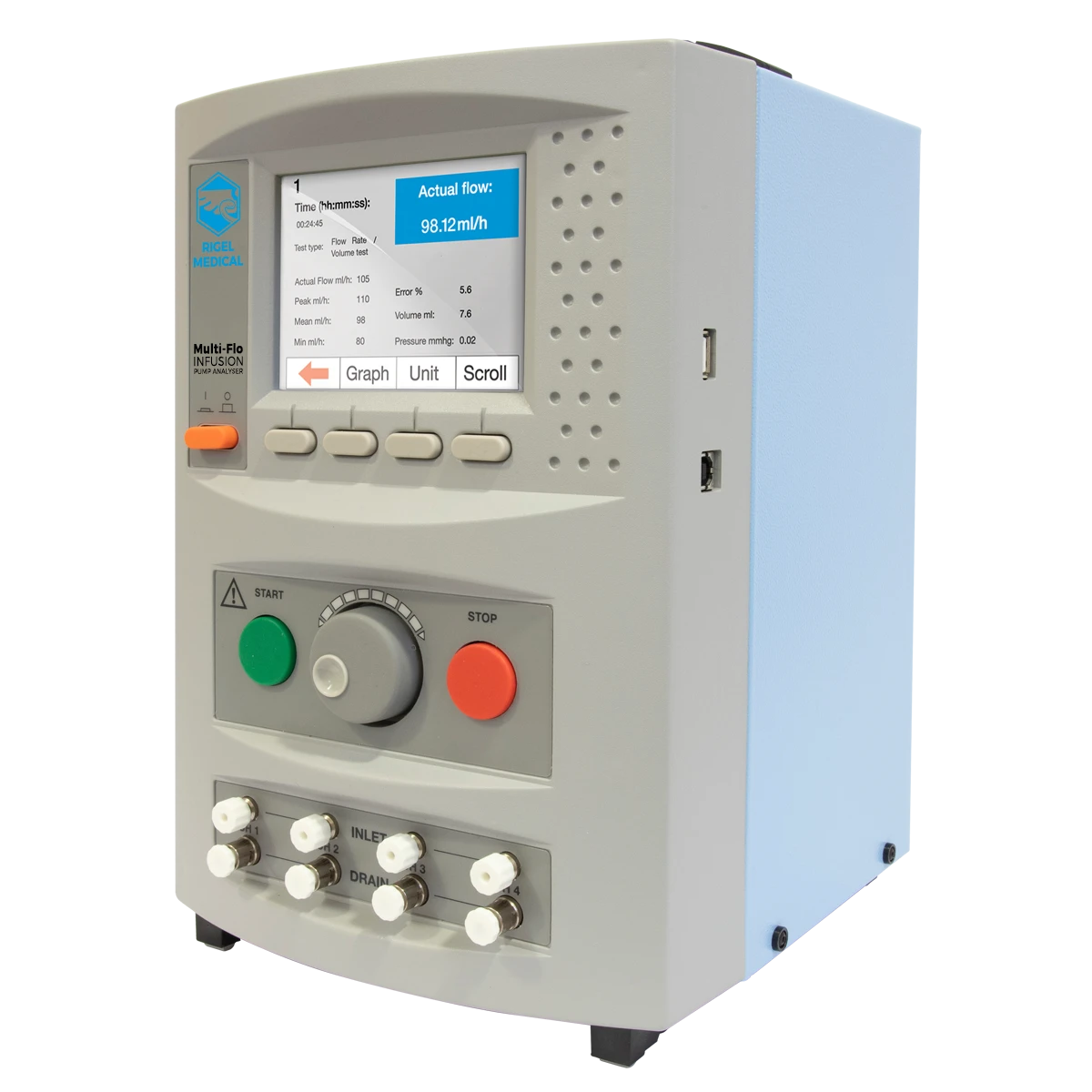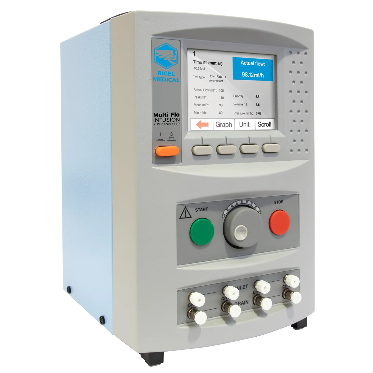 El analizador de bombas de infusión Rigel Multi-Flo, es un instrumento portátil que verifica con precisión y rapidez el rendimiento de todos los dispositivos de infusión (dispositivos médicos utilizados para administrar líquidos y medicamentos a los pacientes de manera controlada y precisa). El Multi-Flo proporciona mediciones de flujo precisas e instantáneas, incluso a caudales bajos, de dispositivos de infusión.